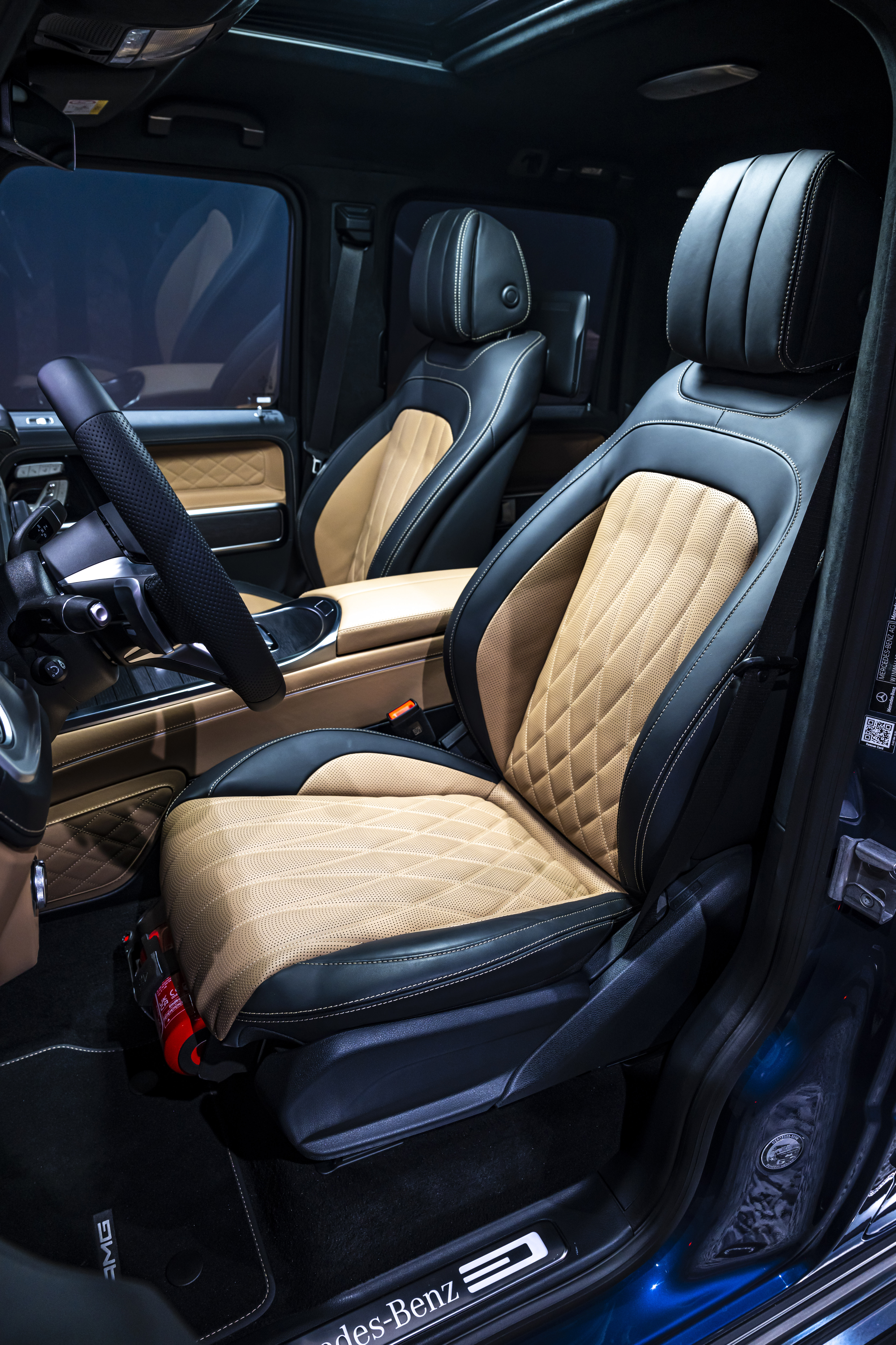 Das Interieur zeigt sich luxuriös und funktional. Mit der Integration des MBUX Infotainmentsystems (Mercedes‑Benz User Experience) wird die neue G-Klasse digitaler als jemals zuvor. Auf Wunsch sorgen KEYLESS-GO, temperierte Getränkehalter, das Burmester® 3D-Surround-Soundsystem und das MBUX High‑End Fond-Entertainment für gesteigerten Komfort. Hinzu kommen zusätzliche und weiterentwickelte Sicherheits- und Assistenzsysteme. Das MANUFAKTUR Angebot zur umfangreichen Individualisierung von Exterieur und Interieur der neuen G-Klasse wurde nochmals erweitert.